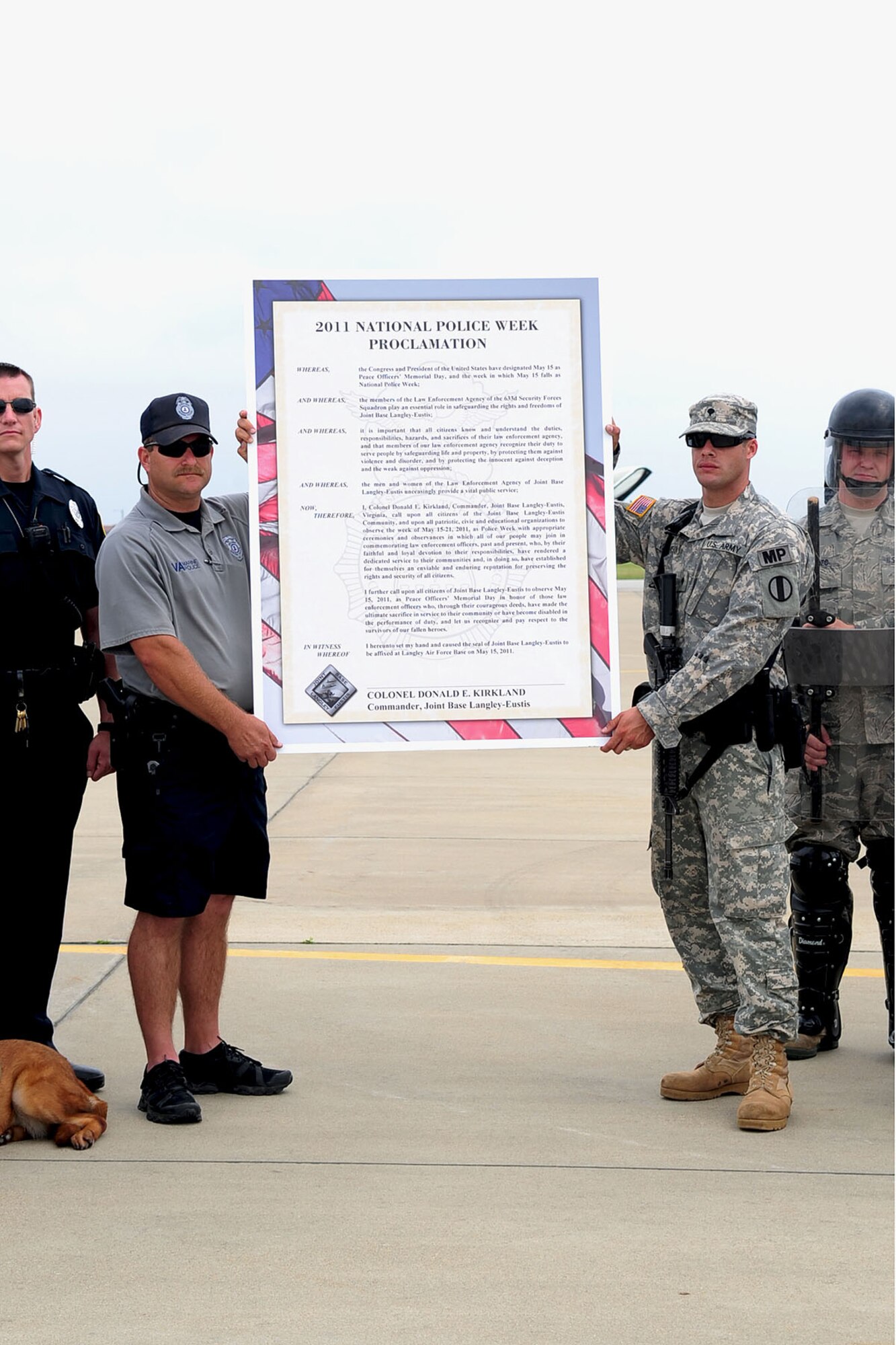 Special Agents Dave Flanagan, Air Force Office of Special Investigations 3rd Field Investigation Squadron, and Michael Hassan, AFOSI 2nd Field Investigations Region, change their targets during the 633d Security Forces Squadron shooting competition at Langley Air Force Base, Va., May 16, 2011. The shooting completion was held in conjunction with National Police Week and included participants from Hampton and Newport News police departments, Hampton park rangers, security forces, and AFOSI. (U.S. Air Force photo by Airman 1st Class Camilla Griffin)(RELEASED)