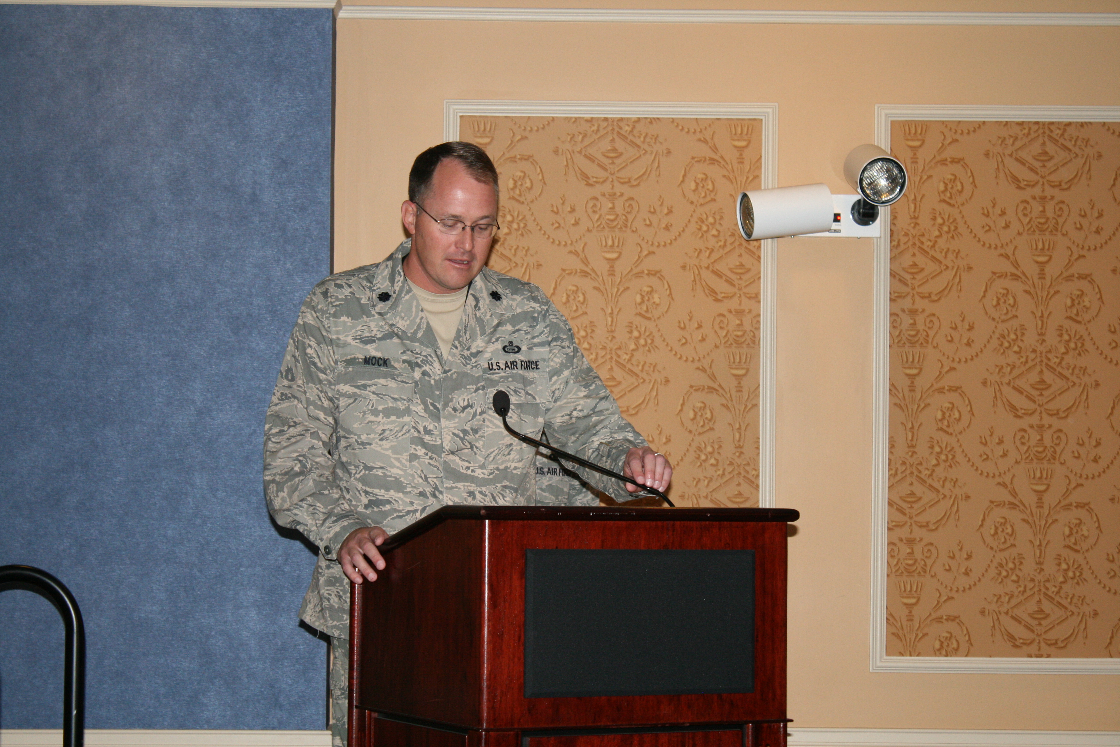 LANGLEY AIR FORCE BASE, Va. -- Lt. Col. James Mock, center, incoming 30th Intelligence Squadron commander, receives the squadron guidon from Col. Mark Cooter, left, 497th Intelligence, Surveillance and Reconnaissance Group commander, while outgoing commander Lt. Col. Brendan Harris, right, looks on at a change of command ceremony June 9 at the Bayside Enlisted Club. (U.S. Air Force photo/Tech. Sgt. Joshua Ward)