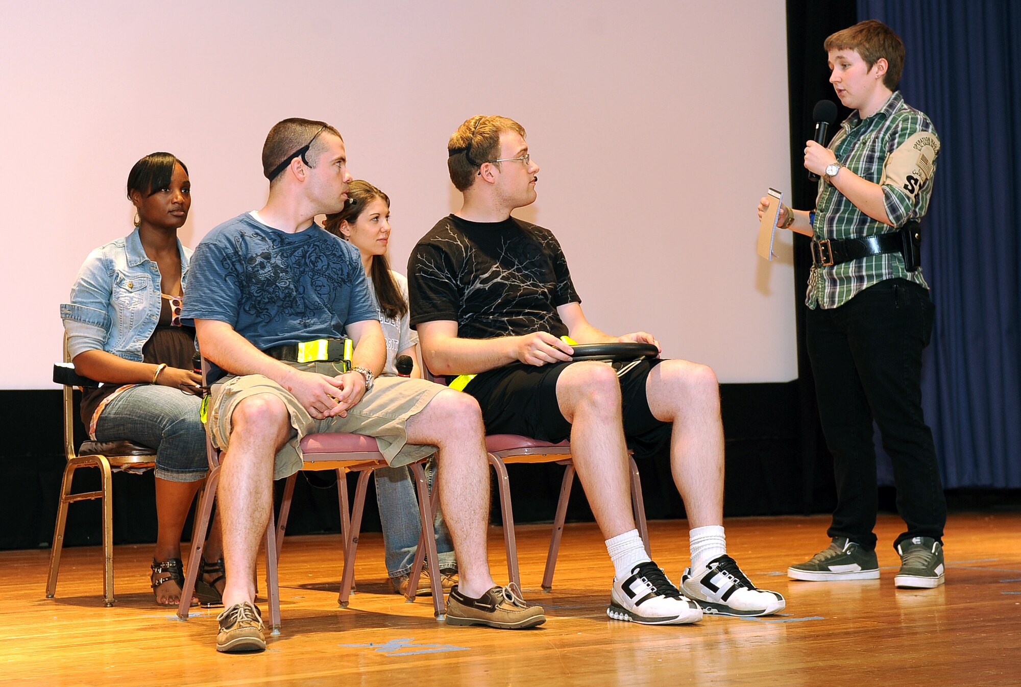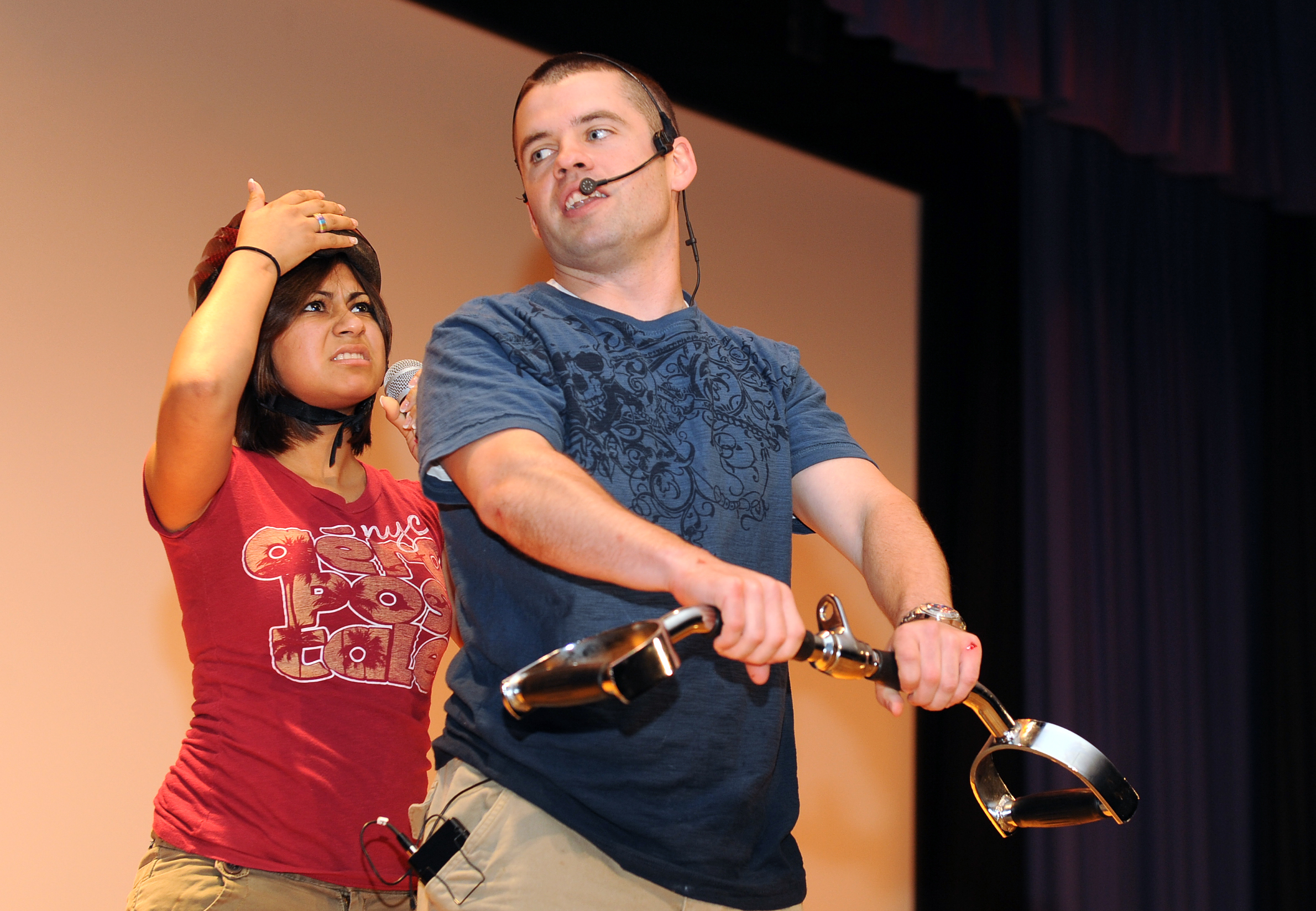 LANGLEY AIR FORCE BASE, Va. -- Airman 1st Class Terry Carroll, 633d Communications Squadron wing information assurance manager, and Airman 1st Class Stephanie Reyes, 1st Medical Group pharmacy technician, simulate riding a motorcycle without a helmet during a wing safety presentation at the base theater May 14. The presentation was part of the Air Combat Command Road Show, a command-wide tour designed to stress the importance of safety and the wingman concept while entertaining Airmen. (U.S. Air Force photo/Airman 1st Class Gul Crockett)