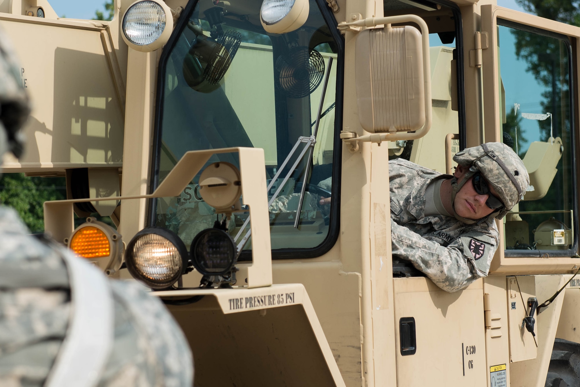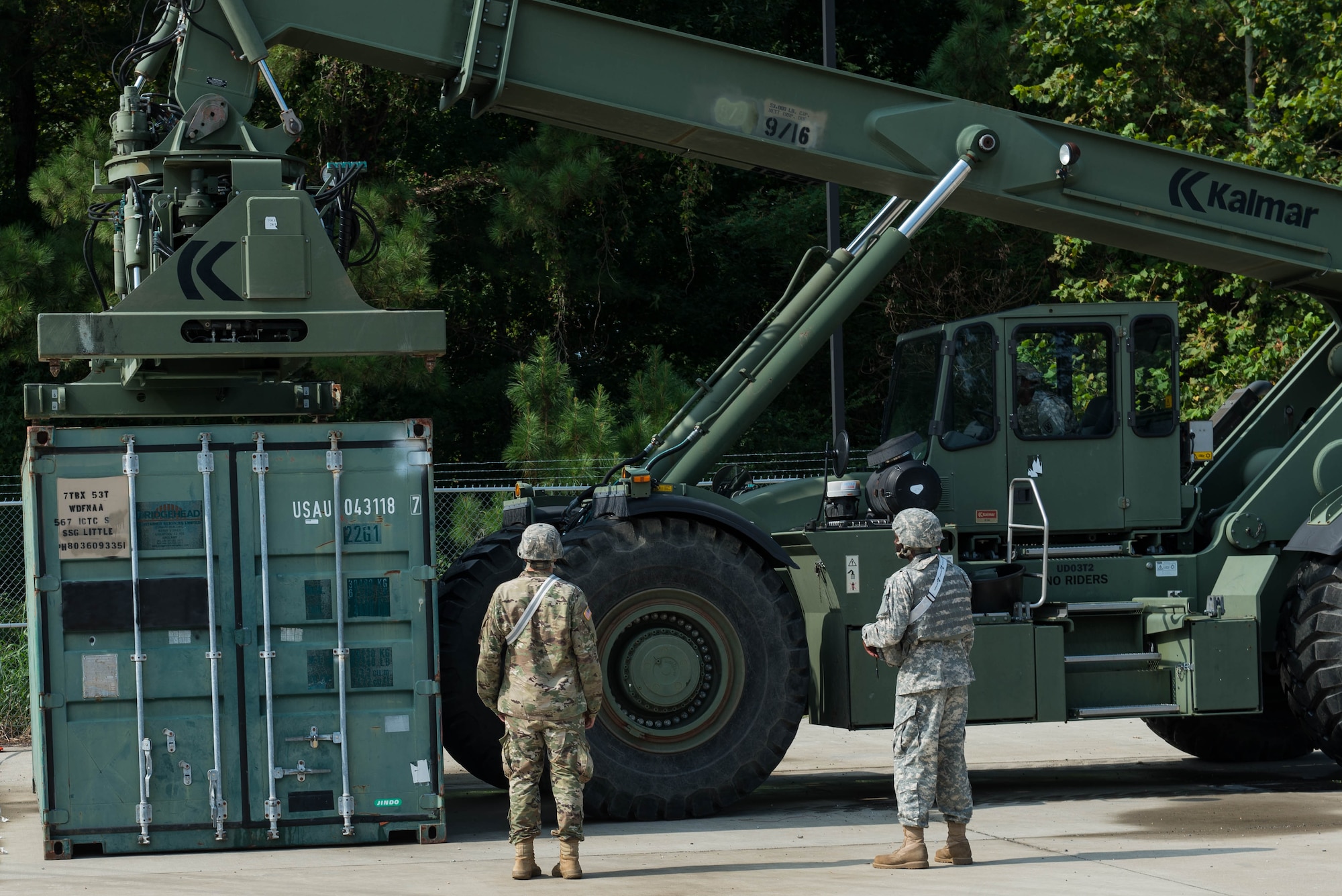 U.S. Army Spc. Vincent Seen, 56th Transportation Battalion 567th Inland Cargo Transportation Company cargo specialist, waits for directions while unloading cargo at Joint Base Langley-Eustis, Va., Sept. 8, 2016. The company simulated being stationed at a port in Italy, where they received shipments via sea and air. (U.S. Air Force photo by Airman 1st Class Derek Seifert)