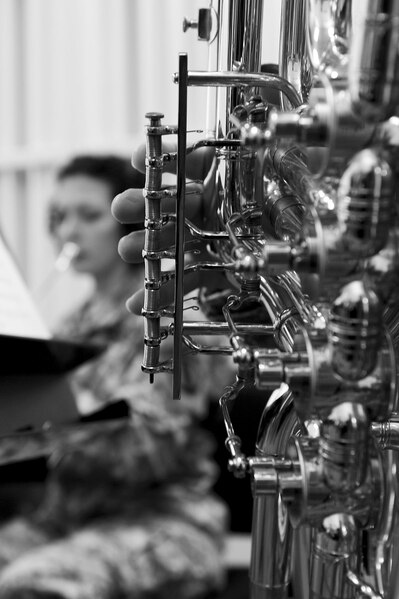 U.S. Army Spc. Anna Leverenz, Training and Doctrine Command band French horn player, (left), performs a song while TRADOC tuba player, Sgt. 1st. Class Tony Reost, plays along during practice at Fort Eustis, Va., Feb. 27, 2013. The band performs concerts in various local communities and states, touring nationwide in support of the TRADOC mission. (U.S. Air Force photo by Staff Sgt. Ashley Hawkins/Released)