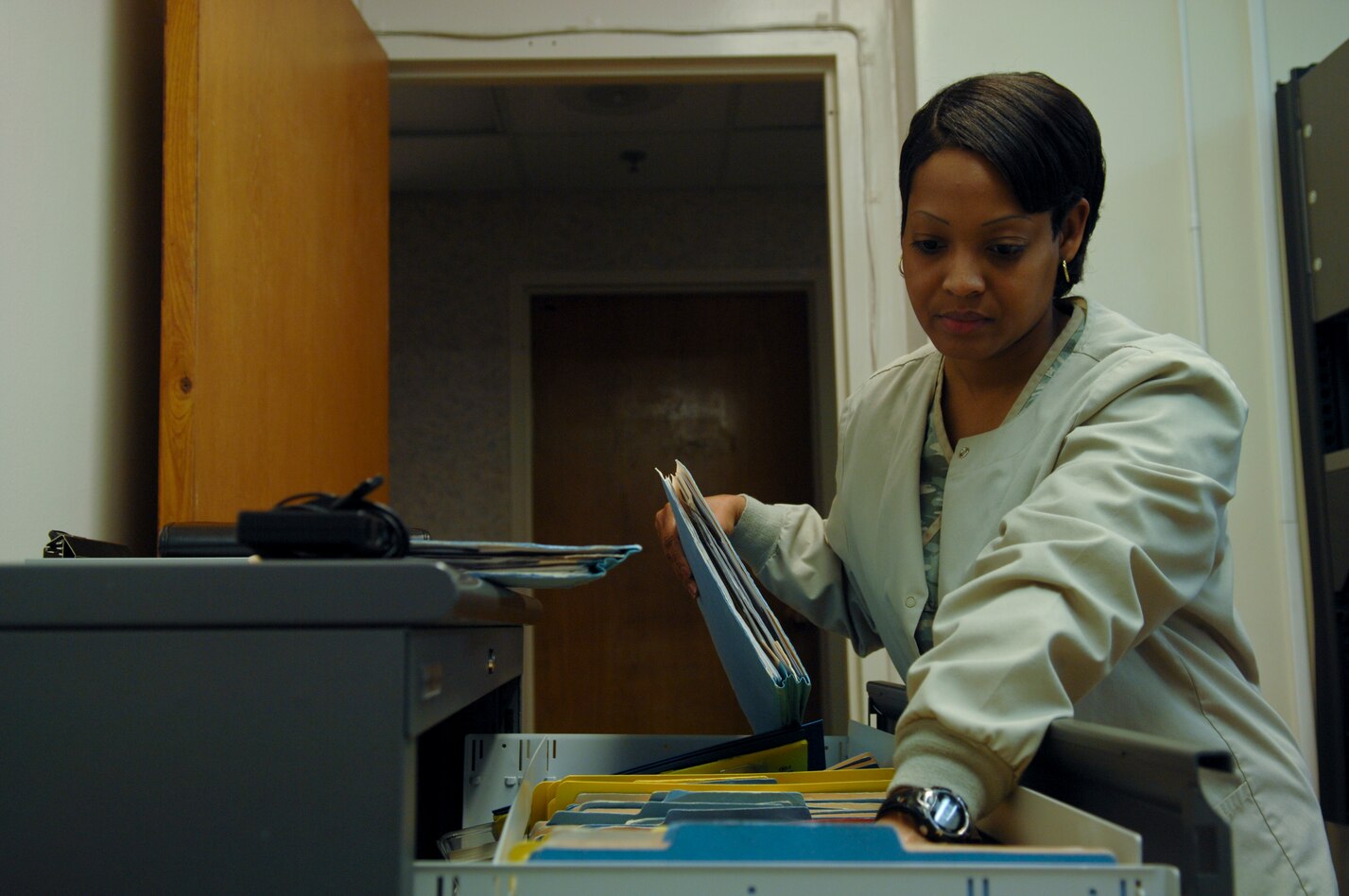 Rika Johnson, 633rd Medical Group allergy nurse, files patient records, Feb. 21, 2013, at U.S. Air Force Hospital Langley, Va. With the addition of an allergist last December, the allergy clinic sees approximately 25 percent more patients a week. (U.S. Air Force photo by Airman 1st Class Austin Harvill/Released)