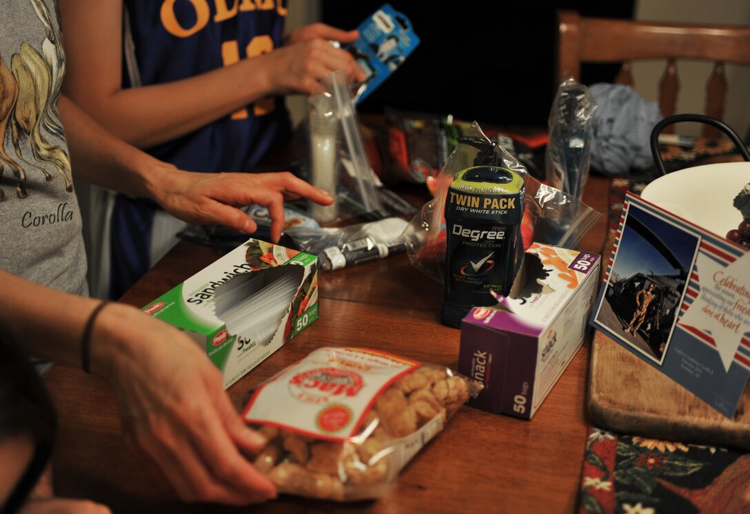 The Castillo family bags items for a Valentine’s Day care package for their husband and father, Chief Master Sgt. Guillermo Castillo, Air Combat Command Inspector General superintendent of the maintenance division, Jan. 30, 2013, at their home in Yorktown, Va. The Castillos are sending items ranging from hand sanitizer, beef jerky, magazines and hand-written cards. (U.S. Air Force photo by Staff Sgt. Katie Gar Ward/Released)