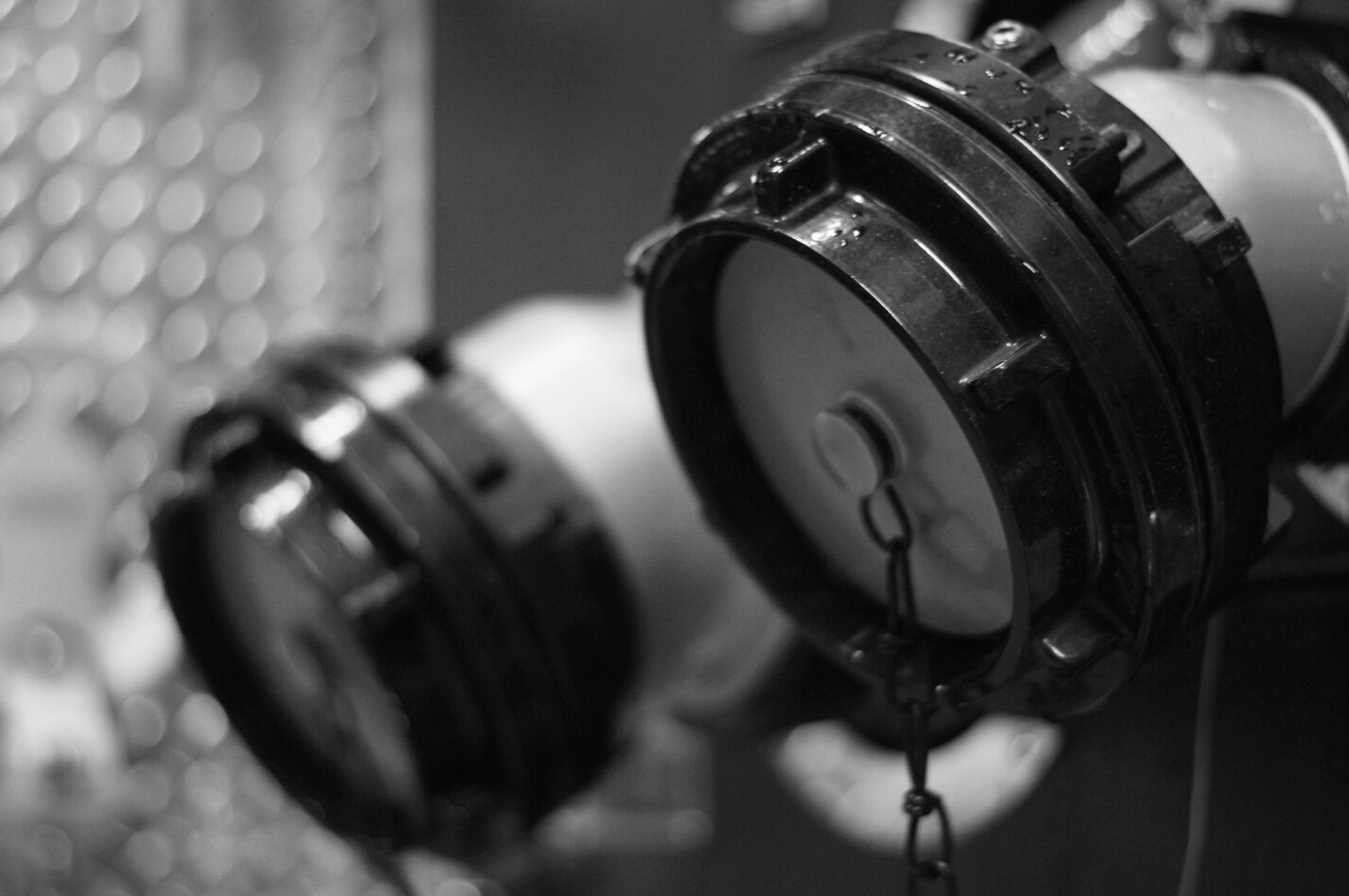 High-pressure water hose connections, like those found on alert vehicles at the fire department on Langley Air Force Base, Va., must be checked and maintained. The fire fighters monitor and maintain their vehicles daily to ensure vehicles are equipped and ready to respond to an emergency. (U.S. Air Force photo by Staff Sgt. Jeff Nevison/Released)