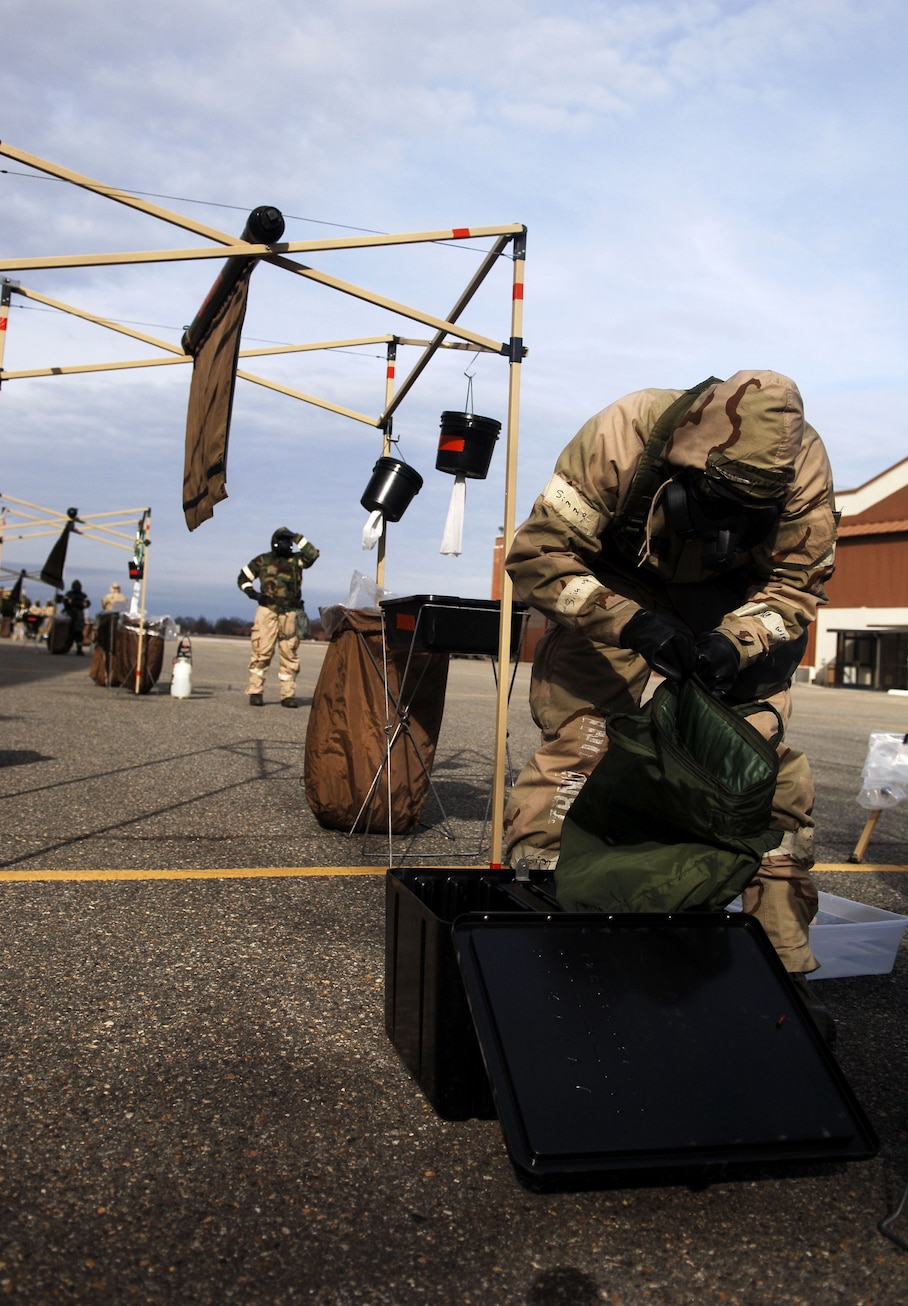 Aircrew flight equipment technicians with the 1st Operations Support Squadron prepare for a pilot decontamination exercise at Langley Air Force Base, Va., Dec. 7, 2012. The aircrew de-contamination process consists of four zones that include seven various de-contamination stations. (U.S. Air Force photo by Staff Sgt. Katie Gar Ward / Released)