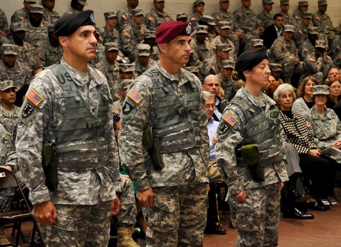 The 7th Sustainment Brigade, and subordinate units participate in a change-of-command ceremony for Col. Lawrence A. Kominiak and Col. Jennifer A. Reinkober, Nov.1, 2012, at McClellan Gym at Fort Eustis, Va. The reviewing official for the ceremony was Brig. Gen. Jeffrey N. Colt, 18th Airborne Corps deputy commanding general, and the commander of troops was Lt. Col. Douglas Pietrowski, 7th Sustainment Brigade deputy commander. (U.S. Air Force photo by Staff Sgt. Wesley Farnsworth/Released)