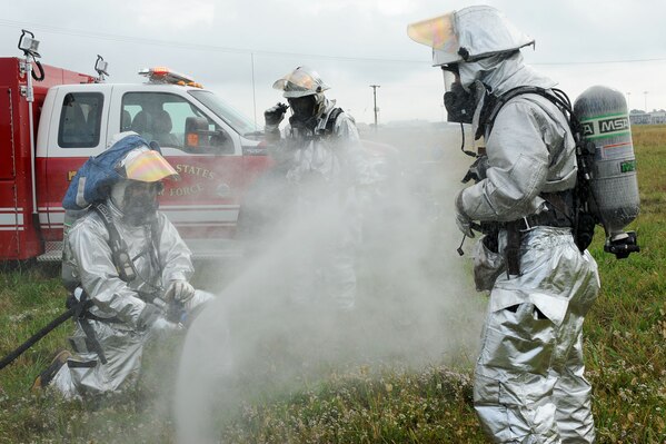 U.S. Air Force Staff Sgt. Derek Dobbins, left, 633rd Civil Engineer Squadron firefighter, cleans Senior Airman Marc Proctor’s suit during a major accident response exercise at Langley Air Force Base, Va., Oct. 19, 2012. The exercise was held to assess how accurately first-responders search and recover major accident victims and clear out the incident scene. (U.S. Air Force photo by Staff Sgt. Ashley Hawkins/Released)