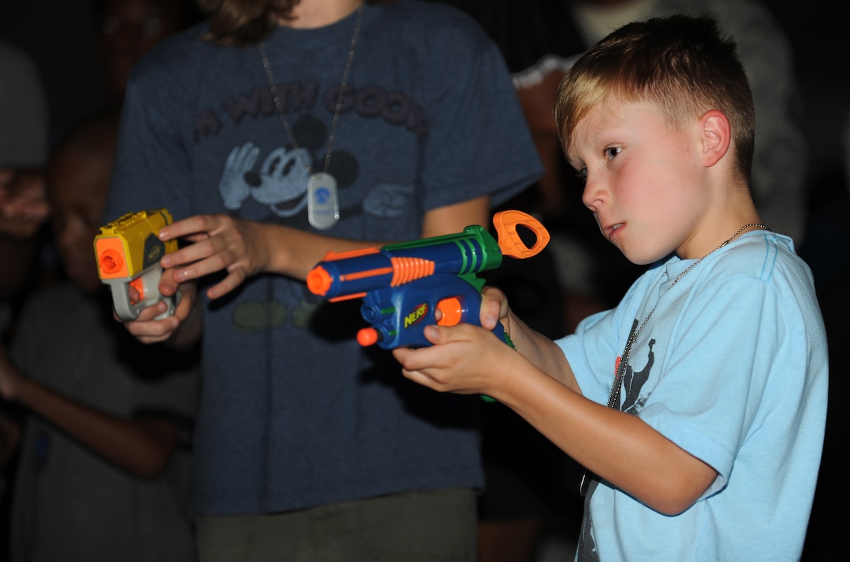 Jack Dandaneau, 9, son of Master Sgt. Julie Dandaneau, takes aim at a target during the Operation: Hero event at Langley Air Force Base, Va., Aug. 1, 2012. This was the 11th year for the event, which featured an all-new mock deployment line. (U.S. Air Force photo by Senior Airman Jarad A. Denton/Released)