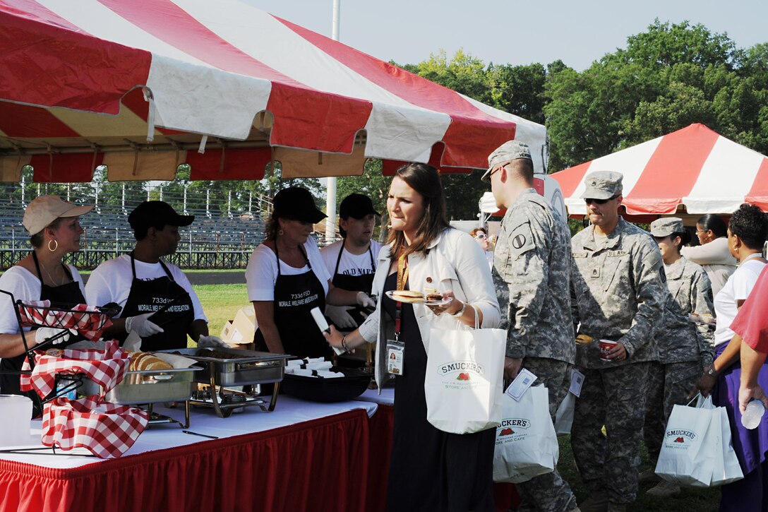 Volunteers serve breakfast to attendees of the Smucker’s Mission Breakfast at Fort Eustis, Va., July 17, 2012. The event was open to all Service members, retirees and dependents. (U.S. Air Force photo by Staff Sgt. Ashley Hawkins/Released)
