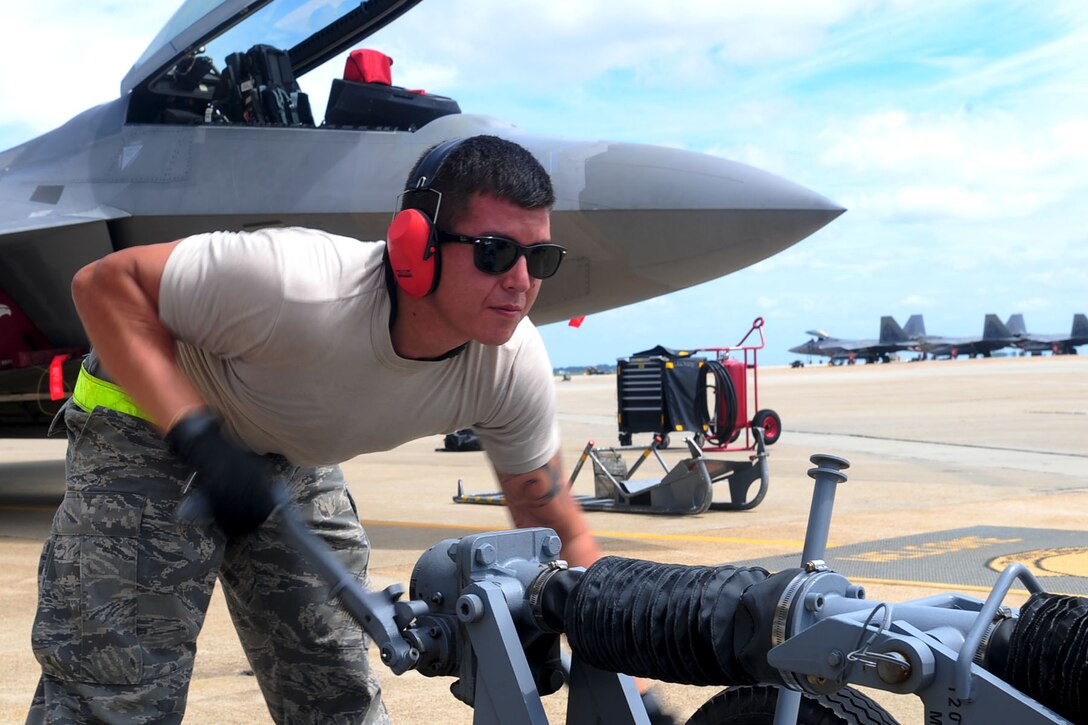 U.S. Air Force Airman 1st Class Kohlin Martin, 27th Aircraft Maintenance Unit weapons loader, prepares to load ordnance onto an F-22 Raptor during the 2nd quarter weapons loading competition at Langley Air Force Base, Va., July 12, 2012. The 27th AMU and 94th AMU compete quarterly, showcasing their abilities to quickly and accurately load weapons. (U.S. Air Force photo by Staff Sgt. Ashley Hawkins/Released)
