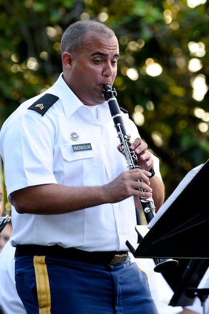 U.S. Army Sgt. Luis Rivera, U.S. Army Training and Doctrine Command Band clarinetist, performs a solo during a song, at Fort Eustis, Va., during the “Music Under the Stars” concert series opener at Ft. Eustis' Magnolia Park, June 7, 2012. The band will perform a concert every Thursday night at Magnolia Park through the end of August. (U.S. Air Force photo by Senior Airman Wesley Farnsworth/Released)