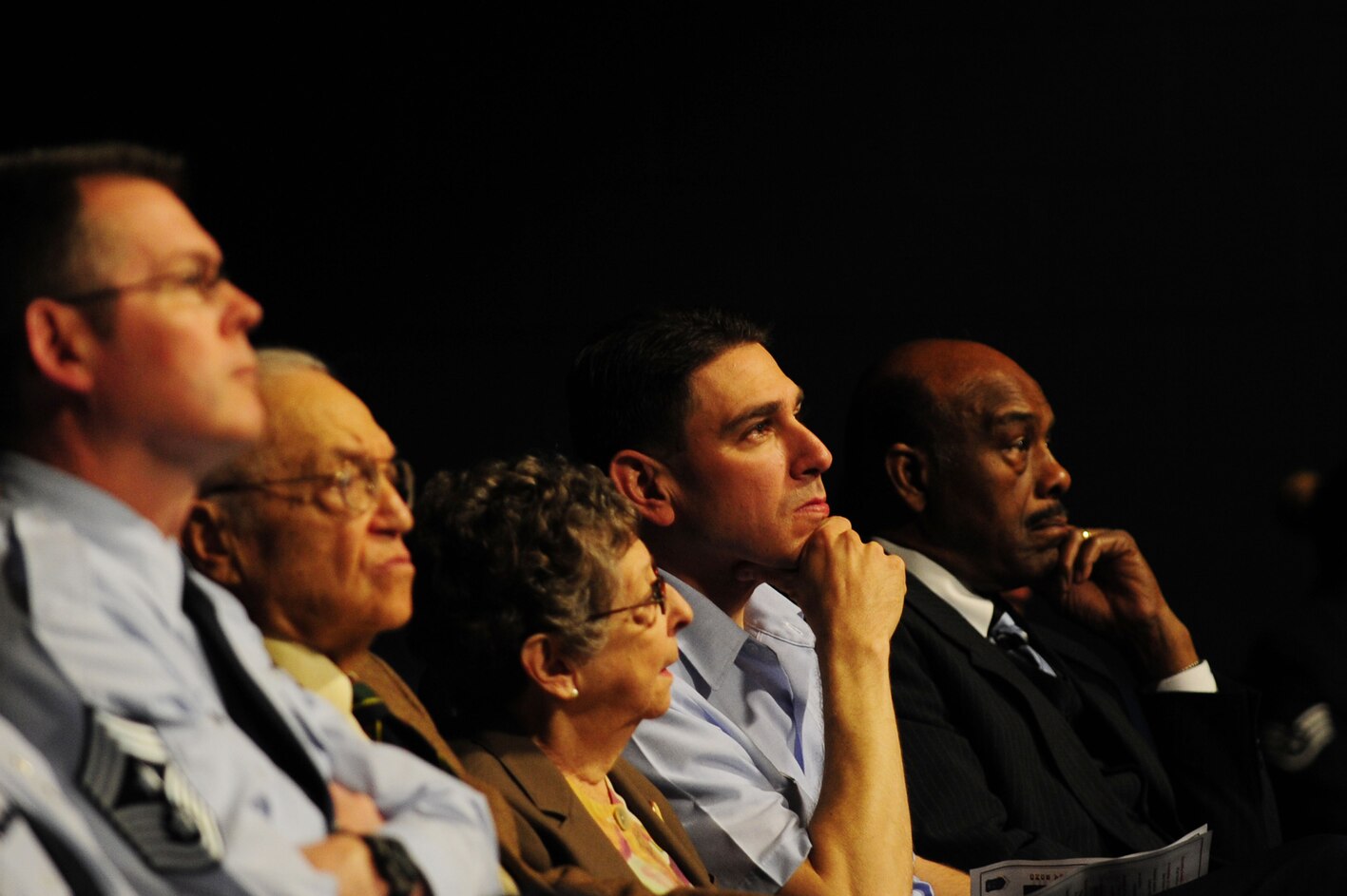 U.S. Air Force Col. Korvin Auch, 633rd Air Base Wing commander, and Chief Master Sgt. Kevin Howell, 633rd ABW command chief, along with Kitty Friedenbach Saks, Holocaust survivor, and her husband, Abbott, watch the keynote presentation during the Joint Base Langley-Eustis Holocaust Remembrance Commemoration at Langley Air Force Base, Va., April 23, 2012. The United States Congress established the Days of Remembrance, spanning from April 15 to 22, as our nation’s annual commemoration of the Holocaust. (U.S. Air Force photo by Airman 1st Class Kayla Newman/Released)