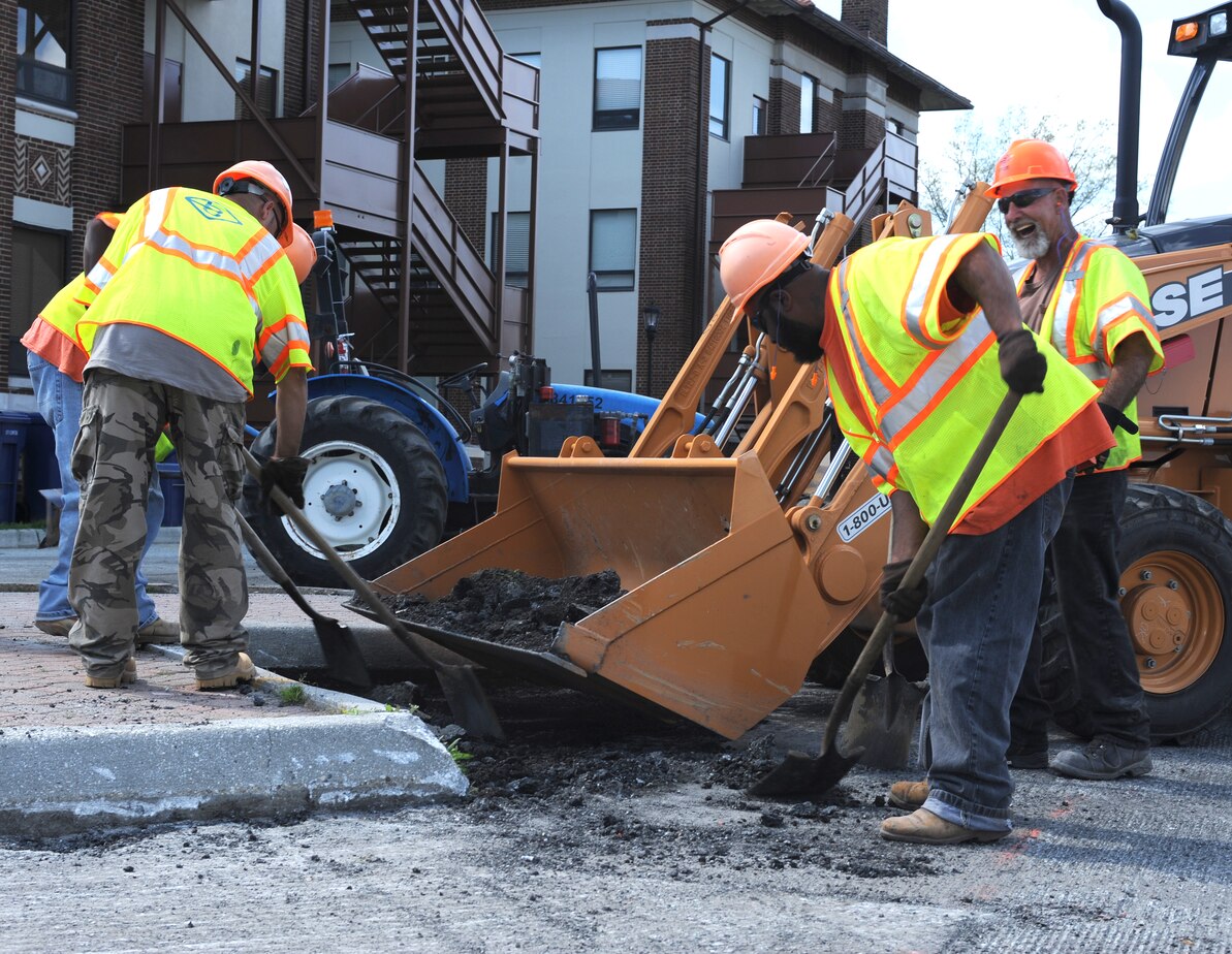 Construction workers shovel excess asphalt from the Air Combat Command Fitness Center parking lot March 22, 2012, at Langley Air Force Base, Va. Gym patrons should prepare for changes to local traffic and parking patterns due to the construction. (U.S. Air Force photo by Airman 1st Class Teresa Cleveland/Released)