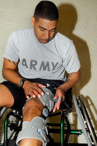 U.S. Army Sgt. Hilton Hunter, Warrior Transition Unit, adjusts the straps on his unloaded brace before the start of his physical training basketball session at the McClellan Fitness Center, March 9, 2012. Hunter participates in adaptive sports and modified PT to help smooth out his recovery both mentally and physically after sustaining injuries in Afghanistan. (U.S. Air Force photo by Staff Sgt. Ashley Hawkins/Released)