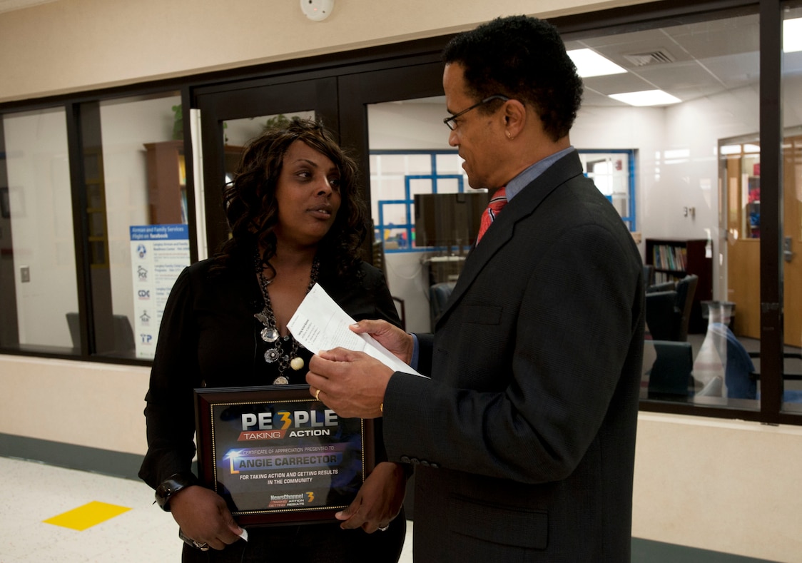 Kurt Williams, WTKR News Channel 3 reporter, interviews Angela Carrecter, Child Development Center program assistant, after awarding her the "Taking Action, Getting Results" award on March 9, 2012 at Langley Air Force Base, Va. Carrecter was nominated for the award by a child’s parent, Sandy Patterson. (U.S. Air Force photo by Senior Airman Stephanie Rubi /Released)