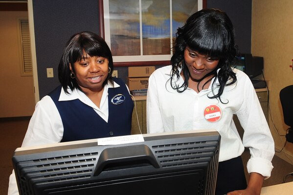 Victoria White, left, the General Smalls Inn reservation manager, assists Dashka Ezouard, a HIRED Program participant working as a desk clerk at the inn, with setting reservations at Fort Eustis, Va., March 6, 2012. The program was created to provide youths with workforce and secondary education training. (U.S. Air Force photo by Staff Sgt. Ashley Hawkins/Released)