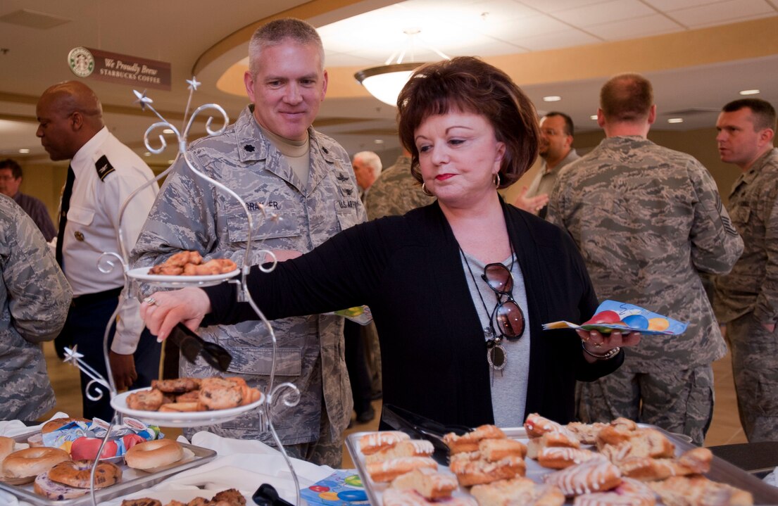 U.S. Air Force Lt. Col. Jeff Granger, 633rd Communications Squadron commander, and Sam Adams, 633rd Mission Support Group deputy director, enjoy pastries during the Langley Inn Open House March 2, 2012, at Langley Air Force Base, Va. Rickenbacker’s Café offers a varity of pastries, food, and refreshments. (U.S. Air Force photo by Senior Airman Stephanie Rubi /Released)
