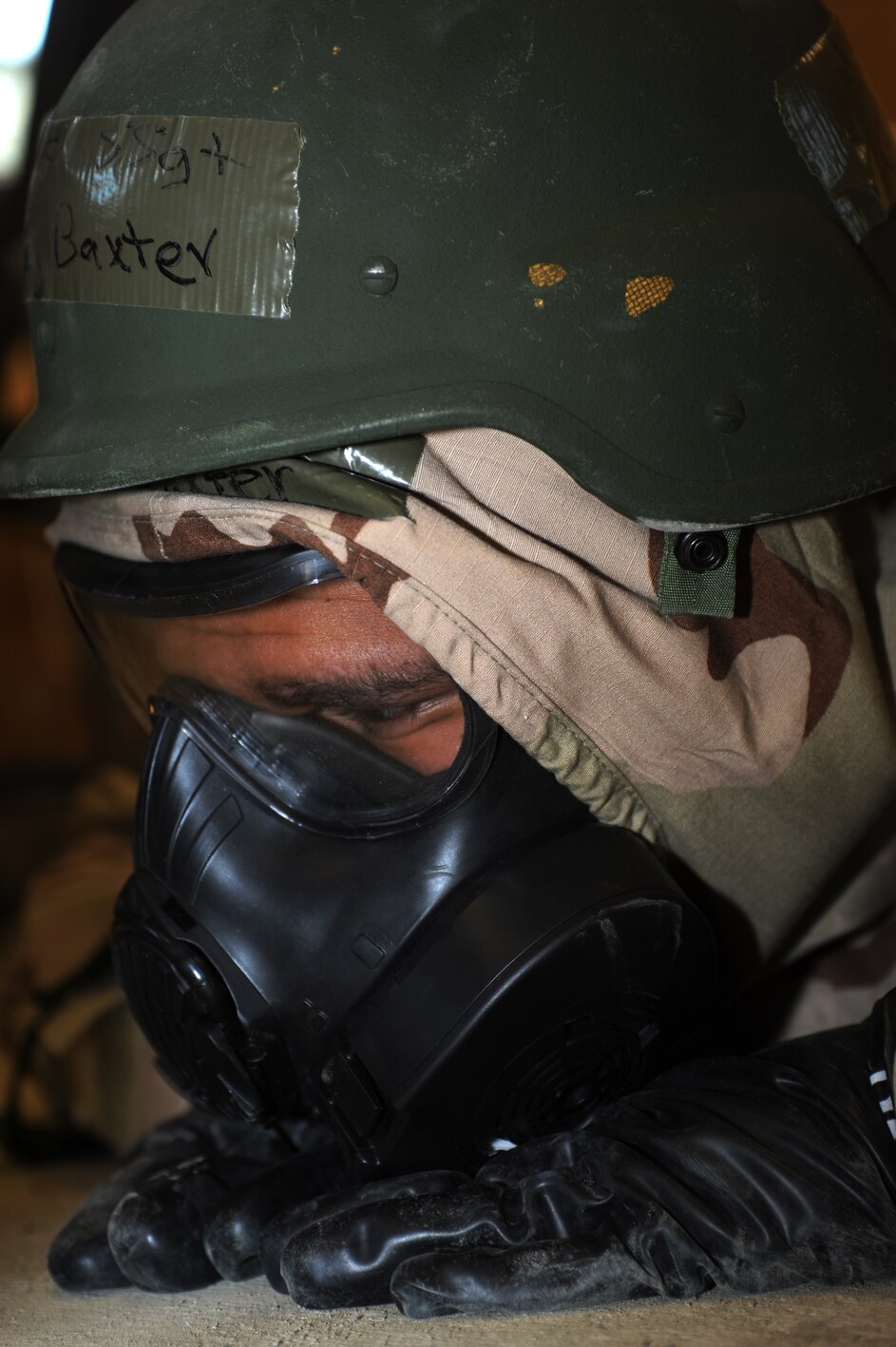 U.S. Air Force Staff Sgt. Gregory Baxter, 633rd Air Base Wing Judge Advocate General paralegal, prepares for simulated missile impact during the phase II operational readiness exercise at Langley Air Force Base, Va., Feb. 15, 2012. Airmen wear the gas mask during a phase II ORE to prepare for potential chemical attacks. (U.S. Air Force photo by Airman 1st Class Teresa Cleveland/Released)