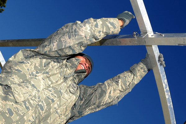 U.S. Air Force Staff Sgt. Emmerson Galupo, 633rd Medical Operations Squadron emergency medical technician, builds a temporary protection tent during an operational readiness exercise at Raptor Town at Langley Air Force Base, Va., Feb. 13, 2012. The three-day exercise prepared Airmen for future inspections and exercises in the coming months. (U.S. Air Force photo by Airman 1st Class Racheal Watson/Released)