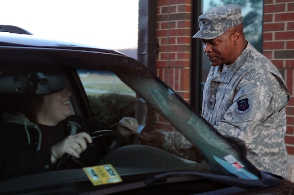 U.S. Army Col. Reggie Austin, 633rd Air Base Wing vice commander, checks common access cards during the Air Force Assistance Fund doughnut fundraiser at the Langley Air Force Base West Gate, Feb. 7, 2012. Austin and other members of Langley AFB raised $2,100 in doughnut sales with all proceeds going to AFAF programs. (U.S. Air Force photo by Staff Sgt. Jeff Nevison/Released)