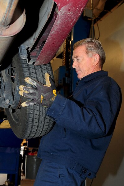 Bill Neff, Automotive Service shop mechanic, replaces a tire on a customer’s vehicle at Fort Eustis, Va., Feb. 1, 2012. The service center is open from 8 a.m. to 5 p.m., Monday through Friday. (U.S. Air Force photo by Staff Sgt. Ashley Hawkins/Released)