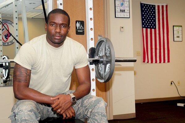 Airman 1st Class Ugochukwu Nwosu works out in the 1st Operations Support Squadron intelligence building in his spare time at Langley Air Force Base, Va. The 26-year-old is a native of Lagos, Nigeria, and enlisted into the Air Force to "give back to the country that did so much" for him. He is currently pursuing his commission into the Army in the "Blue-to-Green" program. (U.S. Air Force photo by Staff Sgt. Ashley Hawkins/Released)