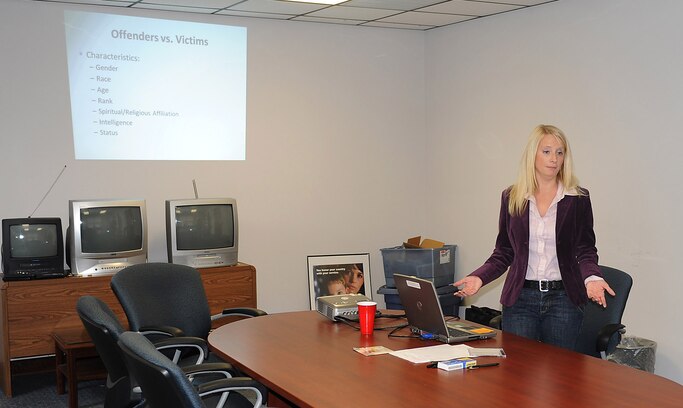 A.J. Brandt, Family Advocacy outreach manager, briefs on characteristics of “Offenders vs. Victims” during the Family Advocacy Safety Education Seminar at Fort Eustis Jan. 20. The Safety Education Seminar provides education on the dynamics of domestic violence and child abuse. (U.S. Air Force Photo by Staff Sgt. Antoinette Gibson/Released)