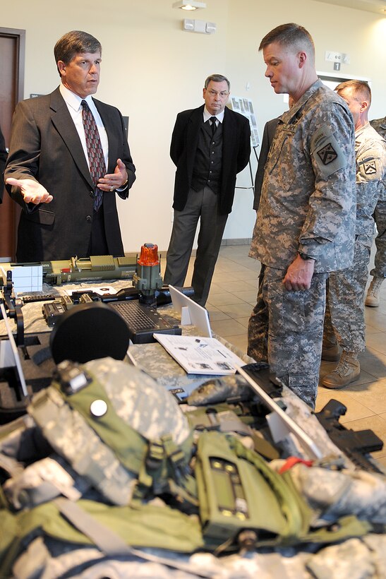 Jim Buchwald, Army Training Support Center Life Training Systems, chief briefs U.S. Army Lt. Gen David Perkins, the new Combined Arms Center commander during his visit to the Army Training Support Center ATSC at Fort Eustis. Jan. 4. Perkins spent the day in various briefings, reviewed a product display, and toured ATSC's buildings. (U.S. Air Force photo by Staff Sgt. Antoinette Gibson/Released)