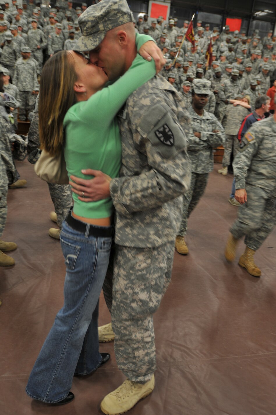 1st Lt. Zack Fulkerson (right), 53rd Transportation Battalion receives a welcome home kiss upon his return from Iraq from his wife, Shelly, the morning of Dec. 21 at Fort Eustis' Anderson Field House. (U.S. Army photo by Sgt. 1st Class Kelly Jo Bridgwater)