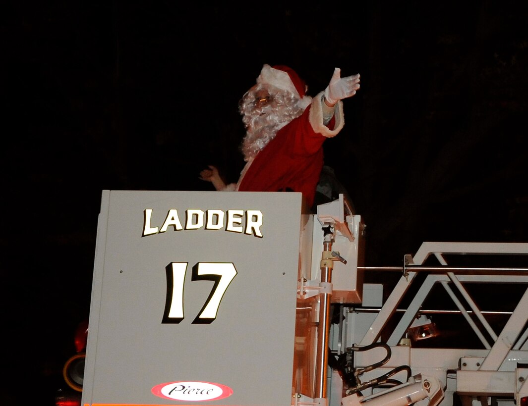 Santa Claus greets children from a fire truck during the 44th Annual Christmas tree lighting ceremony at Langley Air Force Base, Va., Dec. 8, 2011. Families gathered around for the annual Christmas tree lighting ceremony where they enjoyed caroling, lighting the tree, and a visit from Santa Claus. (U.S. Air Force photo by Staff Sgt. Dana Hill)