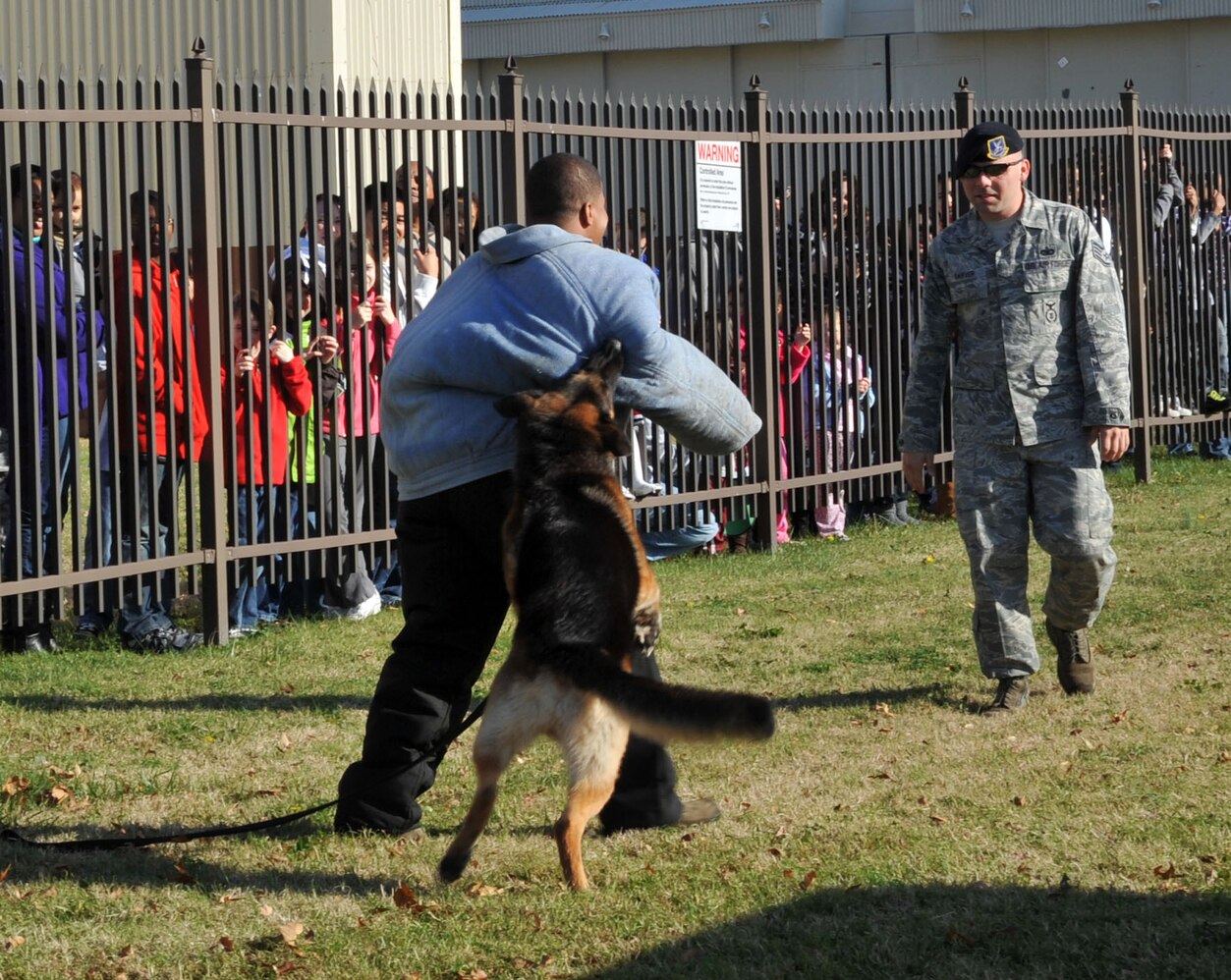 Members of the 633rd Security Forces Squadron military working dog team, perform a demonstration for children and parents at the 2011 Operation Hero event at Langley Air Force Base, Va., Nov. 19, 2011. The Tenth Annual Operation Hero event was hosted to give children of Airmen insight into what their parents experience during the deployment process. (U.S. Air Force photo by Airman 1st Class Camilla Griffin/Released)