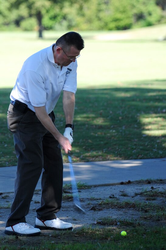 U.S. Air Force Chief Master Sgt. Kevin Howell, 633rd Air Base Wing command chief, participates in the second Langley Chief's Group "Chief Mik" Golf Tournament at Langley Air Force Base, Va., Oct. 21, 2011. The tournament is held annually in honor of the late Chief Master Sgt. Denise "Mik" Mikolajczyk. (U.S. Air Force photo by Airman 1st Class Kayla Newman/Released)