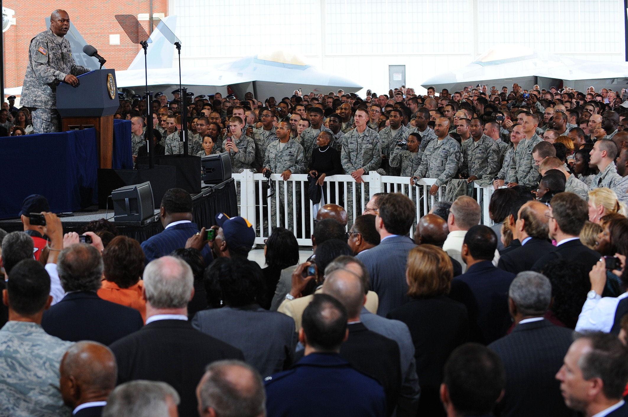 U.S. Army Col. Reggie Austin, 633d Air Base Wing vice commander, prepares the crowd for President Barack Obama’s visit to Langley Air Force Base, Va., Oct. 19, 2011. The president and first lady visited Langley during the American Jobs Act bus tour. (U.S. Air Force photo by Tech. Sgt. Christina M. Styer/Released)