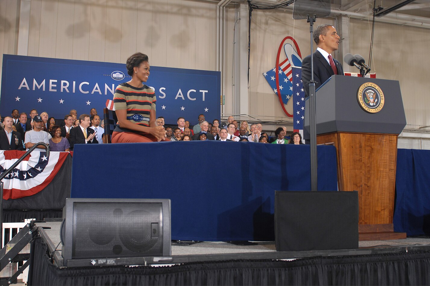 President Barack Obama was joined by his wife, Michelle, at Langley Air Force Base, Va., Oct. 19, 2011. Obama hopes to put more money in the pockets of working men and women by encouraging businesses to hire veterans. (U.S. Air Force photo by Staff Sgt.Antoinette Gibson /Released)