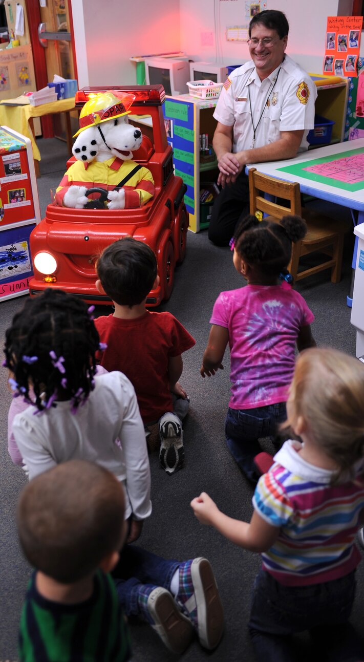 Sparky Jr. and Rick Pettyjohn, 633rd Civil Engineer Squadron assistant chief of fire prevention, talk to children about fire safety during National Fire Prevention Week at Langley Air Force Base, Va., Oct. 13,2011. Firefighters offered demonstrations and educational events throughout the week promoting fire safety and prevention. (U.S. Air Force photo by Airman 1st Class Teresa Cleveland/Released)