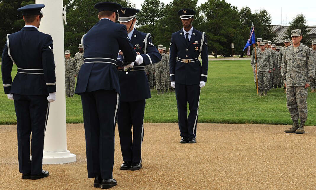 Col. Korvin Auch, 633d Air Base Wing commander, watches the Langley Air Force Base Honor Guard perform a flag folding ceremony, Langley Air Force Base, Va., Sept. 16, 2011. Team Langley celebrated the 64th birthday of the Air Force during a special retreat ceremony. (U.S. Air Force photo by Airman 1st Class Teresa Cleveland)