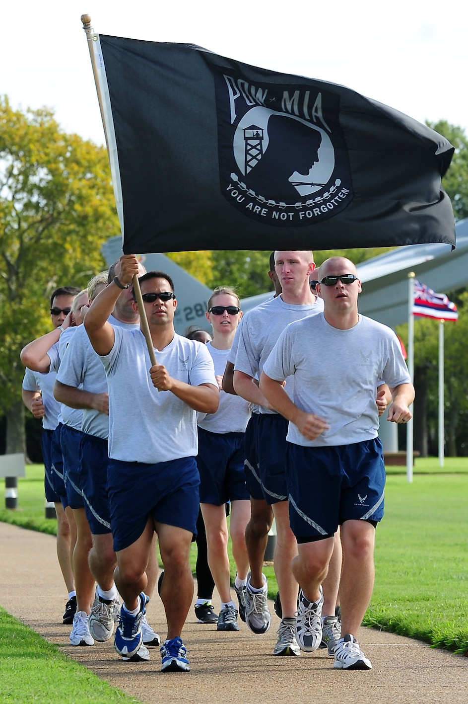 Airmen run through Heritage Park during the POW/MIA 24-hour Run/Walk Vigil at Langley Air Force Base, Va., Sept. 16, 2011. Approximately 350 runners and walkers participated in the two-day event honoring National POW/MIA Recognition Day, observed on the third Friday in Sept. (U.S. Air Force photo by Airman 1st Class Kayla Newman/Released)