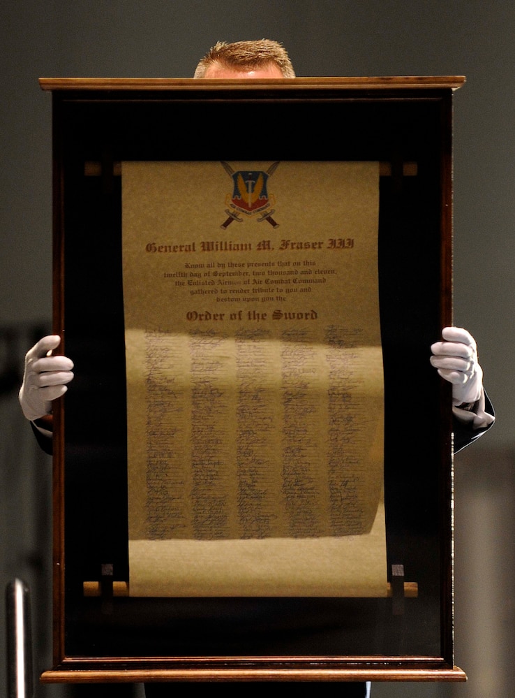 U.S. Air Force Command Chief Master Sgt. Kevin Howell, 633rd Air Base Wing, presents the scroll to the audience during the Order of the Sword Ceremony Sept. 12, 2011, in Hampton, Va. The scroll was signed by all Airmen in attendance and presented to Gen. William M. Fraser III, commander of Air Combat Command, for his outstanding military leadership. (U.S. Air Force photo by Staff Sgt. Dana Hill/Released)