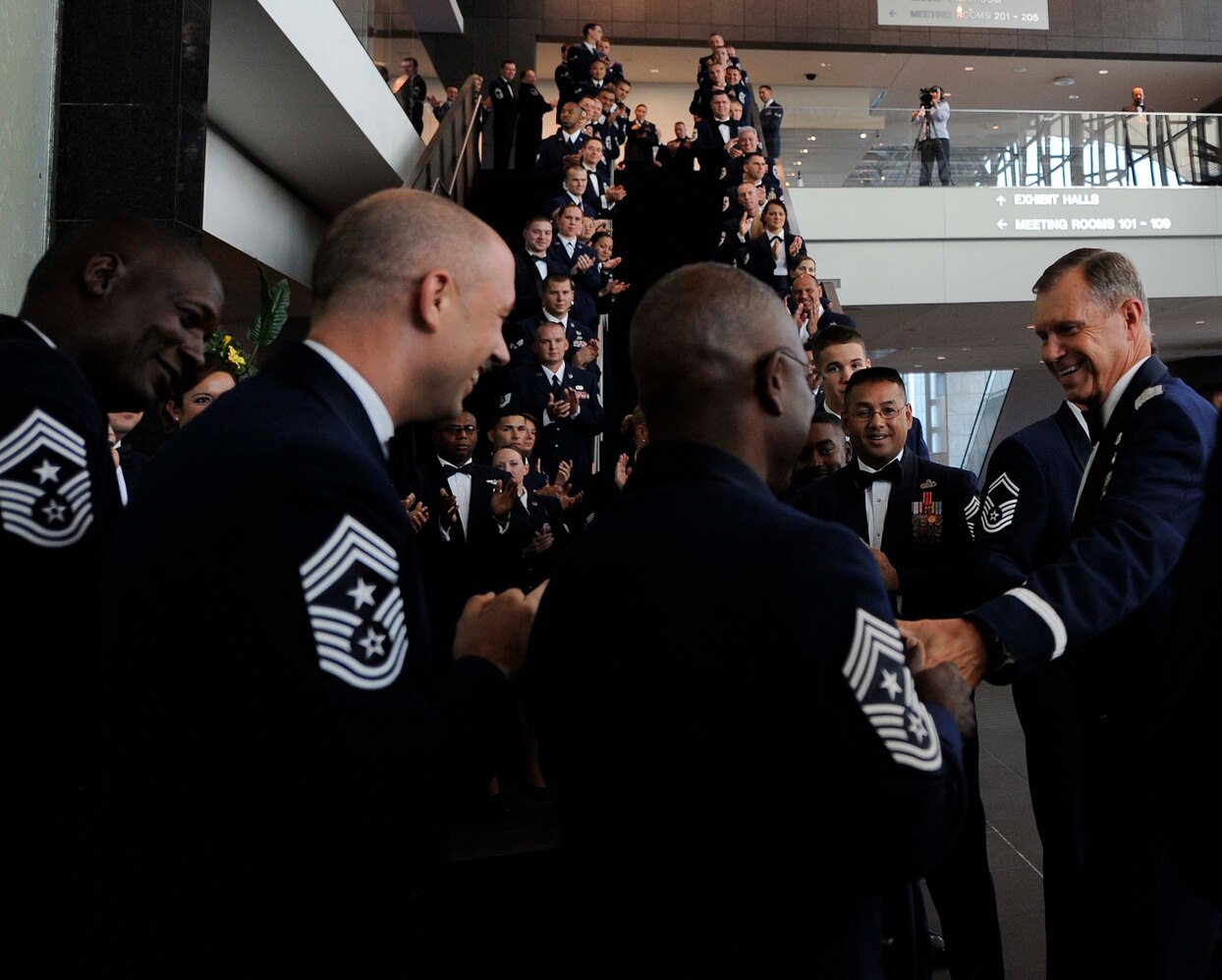 U.S. Air Force Gen. William M. Fraser III commander of Air Combat Command greets command chiefs from ACC bases during the Order of the Sword Ceremony Sept. 12, 2011, in Hampton, Va. Fraser was recognized by the command?s enlisted Airmen for his superior leadership and dedication to the command. (U.S. Air Force photo by Staff Sgt. Dana Hill/Released)