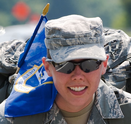 U.S. Air Force Senior Airman Nichole Stafford, 633rd Security Forces Squadron desk sergeant, participates in the Security Forces 9/11 Ruck March to Remember in Arrington, Va., Aug. 25, 2011. The march honored the defenders who lost their lives since the start of Operation Enduring Freedom. (U.S. Air Force photo by Tech. Sgt. Barry Loo/Released)