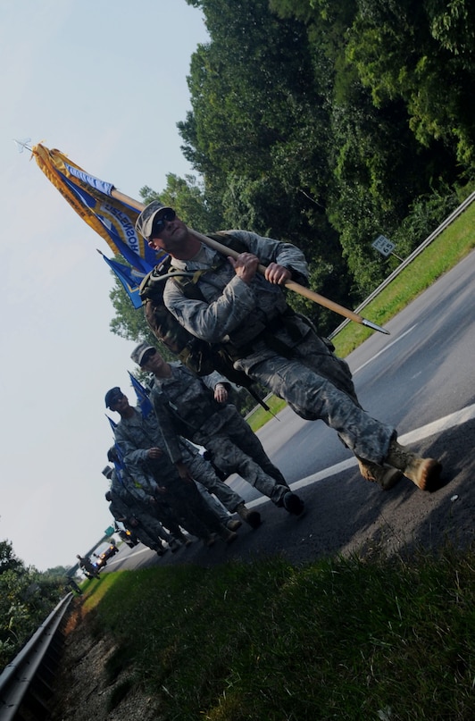 U.S. Air Force Senior Airman Eric Pulse, 633rd Security Forces Squadron patrolman, carries the guidon during the Security Forces 9/11 Ruck March to Remember in Amherst, Va., Aug. 25, 2011. More than 30 Langley Air Force Base members used an estimated 20 minute mile pace to cover 141 miles in five days. . (U.S. Air Force photo by Airman 1st Class Racheal Watson/Released)
