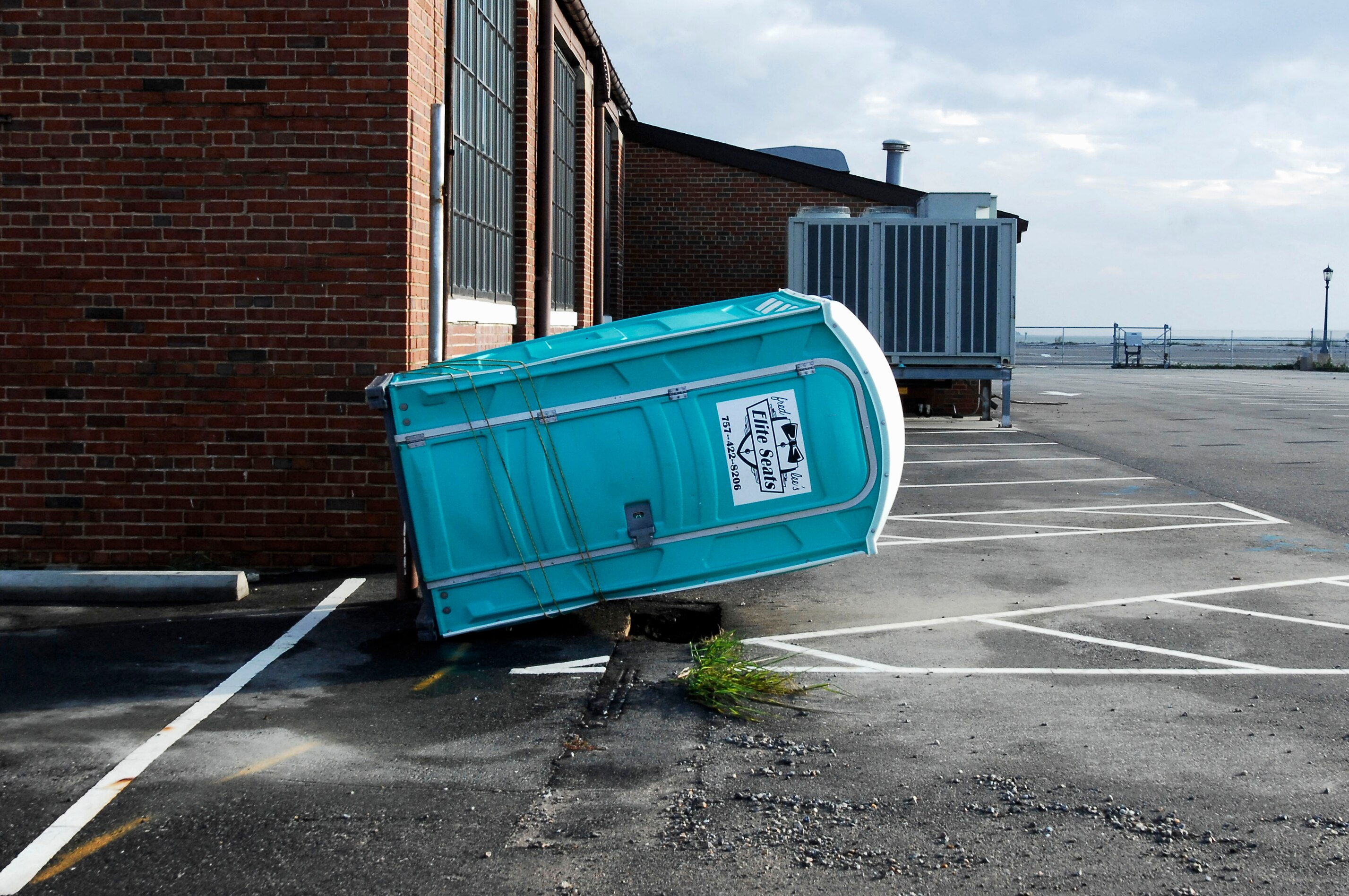 A portable toilet is knocked over on the Air Combat Command campus as a result of high winds caused by Hurricane Irene at Langley Air Force Base, Va., Aug. 28, 2011. Winds reached speeds of up to 67 miles per hour on Langley AFB and 60 MPH on Fort Eustis. (U.S. Air Force photo by Airman 1st Class Kayla Newman/Released)