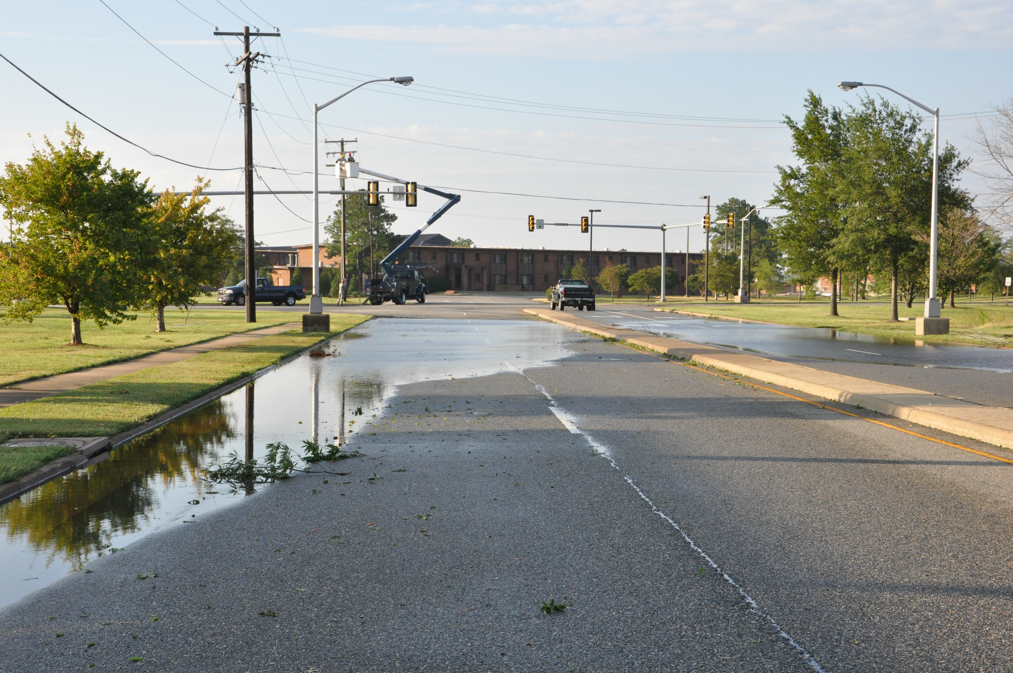 Water pools on Tuskegee Airmen Boulevard near the AAFES Class Six/Shoppette at Langley Air Force Base, Va., following Hurricane Irene Aug. 28, 2011. Officials said the storm knocked out power to more than 4 million people and was responsible for at least 20 deaths along the East Coast. (U.S. Air Force photo by Senior Airman Jason Joel Brown/RELEASED)
