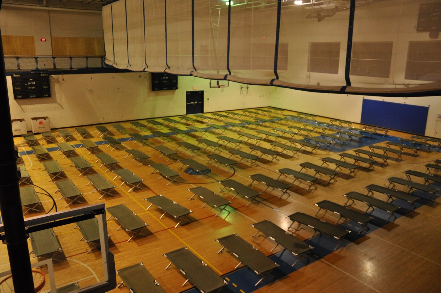 Cots are arranged at Shellbank Fitness Center's temporary shelter at Langley Air Force Base, Va., as Hurricane Irene approaches the area Aug. 27, 2011. Joint Base Langley-Eustis implemented evacuations, base closures and infrastructure protection measures to mitigate storm damage at Langley AFB and Fort Eustis. (U.S. Air Force photo by Senior Airman Jason J. Brown)
