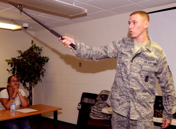 U.S. Air Force Tech. Sgt. Christopher Beavers, 633rd Security Forces Squadron noncommissioned officer in charge of community policing, demonstrates the use of an asp during a citizen’s police academy class in York County, Va., Aug. 4, 2011. The class is to educate participants in techniques that security forces members use on a day-to-day basis. (U.S. Air Force photo by Staff Sgt. Logan Tuttle)