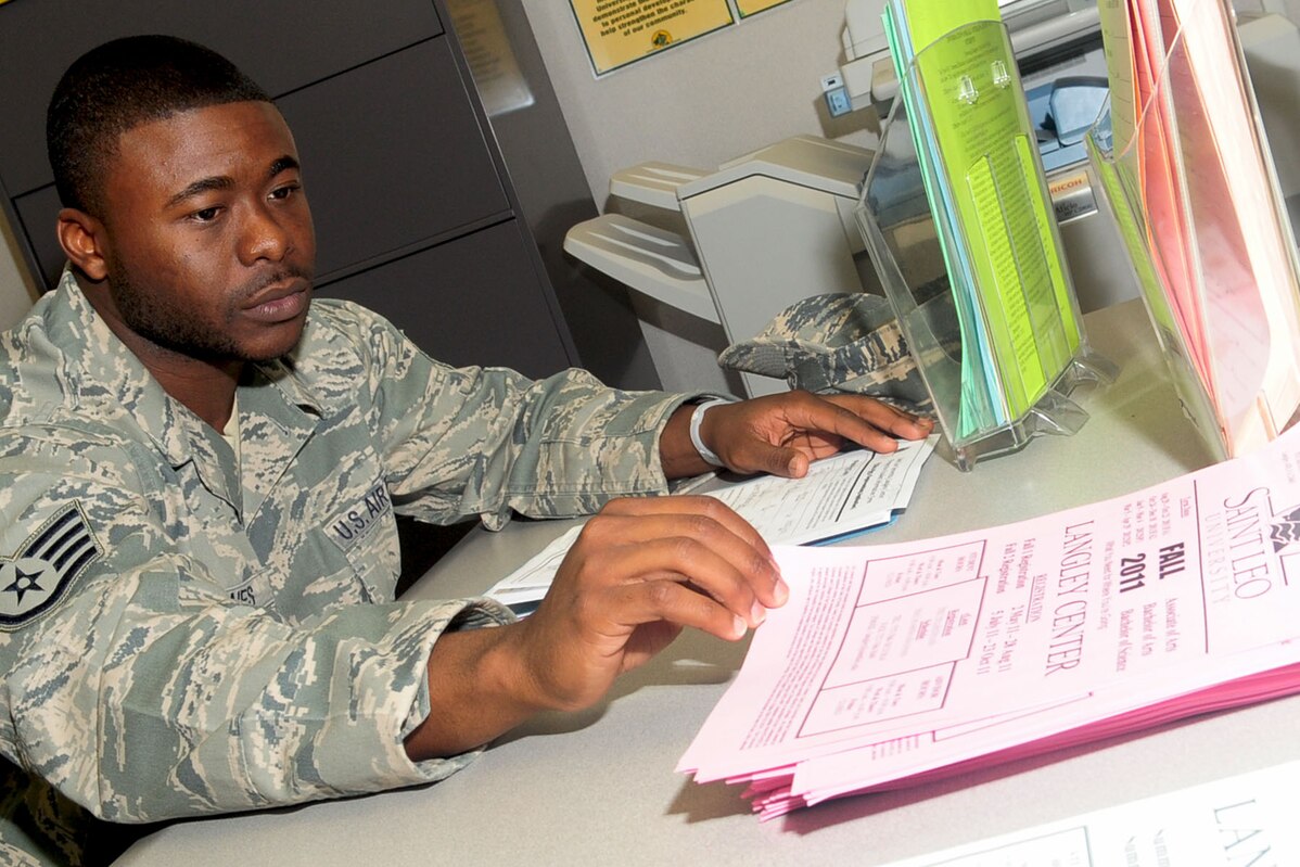 Staff Sgt. Soloman Jones, 633rd Aeromedical Squadron health service manager, looks at a Saint Leo University fall schedule at the Education Center at Langley Air Force Base, Va., July 7, 2011. The education center provides classes, assistance with course and program selections, and information on all options available for retired and active duty military. (U.S. Air Force photo by SSgt Ashley Hawkins/Released)