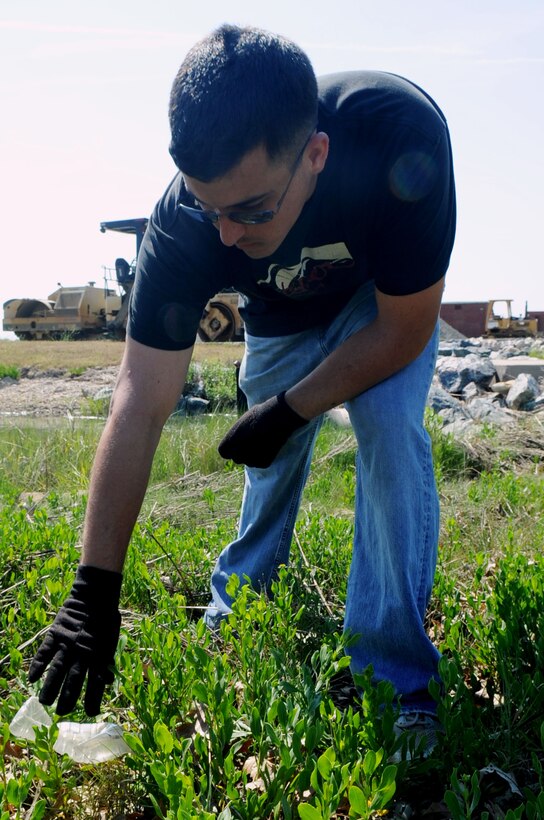 Senior Airman Mackenzie Cunningham, 1st Maintenance Squadron F-22 Raptor crew chief, picks up trash during the 23rd Annual Clean the Bay 2011 at Langley Air Force Base, Va., June 4, 2011. Volunteers collected 2,000 pounds of trash along a 2.5-mile stretch of shoreline. (U.S. Air Force photo by Airman 1st Class Kayla Newman/Released)