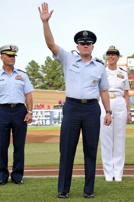 Col. Mark Cooter, 497th Intelligence, Surveillance and Reconnaissance Group commander, greets the crowd gathered for the Norfolk Tides’ Military Appreciation Night May 21, 2011 at Harbor Park Stadium in Norfolk, Va. The event honored local superior performers representing each branch of the Armed Forces. (U.S. Air Force photo by Airman 1st Class Camilla Griffin)(RELEASED)