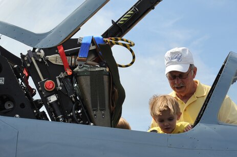 Jim Welsh and grandson Parker Welsh, age three, look into the cockpit of a fighter aircraft, during the AirPower over Hampton Roads open house at Langley Air Force Base, Va., May 15, 2011. The open house educates the public on past and present military aerial capabilities, increases recruiting and shows appreciation to the local community. (U.S. Air Force photo by Airman 1st Class Camilla Griffin/RELEASED)