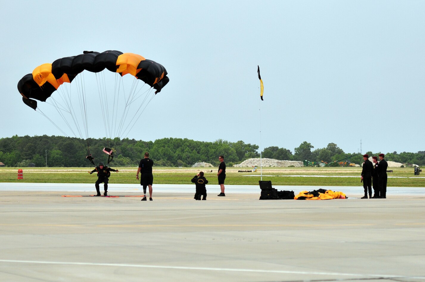 A Golden Knight performs a perfect landing at the Air Power over Hampton Roads open house at Langley Air Force Base, Va., May 14, 2011. The Golden Knights have been wowing audiences at air shows, competitions, and high profile tandems for 50 years. (U.S. Air Force photo by Senior Airman Jonathan Muller)(RELEASED)